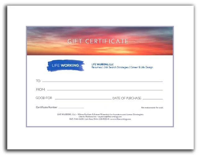 It seems everyone we talk to mentions they know someone who could really use our services. If you have a family member or close friend whom you’d like to help jumpstart a career move or life transition, consider a Life Working® gift certificate. Contact us to discuss and place your order.